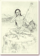 Der berühmte tibetische Yogi Dschetsün Milarepa, der die meisten Jahre seines Lebens einsam in den Schneebergen des Himalaya meditierte und seine Erfahrungen und Einsichten in poetischen Gesängen an seine Schüler weitergab.